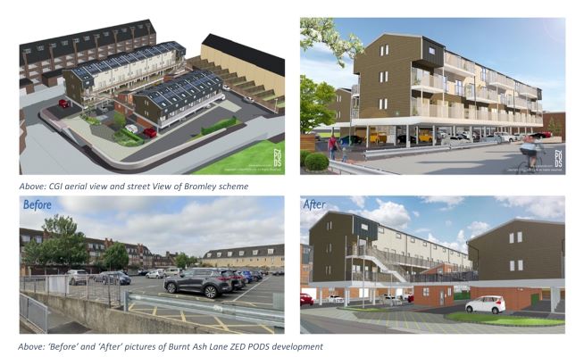 ZED PODS, in partnership with the London Borough of Bromley, has designed and built an innovative, affordable, zero-carbon housing development above an underutilised public car park in Burnt Ash Lane. The self-contained, beautifully designed homes have been erected on steel podium to preserve over 80% of existing car parking spaces for the local community. The car park has been also upgraded with additional 5 CCTVs for the development and two 4.5m pole mounted for the carpark, 15 EV chargers, new 40 cycle storage and new areas of planting.